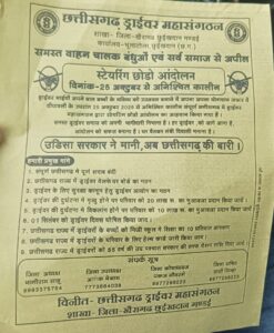 छत्तीसगढ़ ड्राइवर महासंगठन ने अपनी लंबित मांगों को लेकर सरकार के खिलाफ मोर्चा खोल दिया है। संगठन ने कलेक्टर को ज्ञापन सौंपते हुए चेतावनी दी है कि यदि उनकी मांगों पर शीघ्र निर्णय नहीं लिया गया तो 25 अक्टूबर 2025 से प्रदेशभर के ड्राइवर “अनिश्चितकालीन स्टीयरिंग छोड़ आंदोलन” पर उतरेंगे।सं